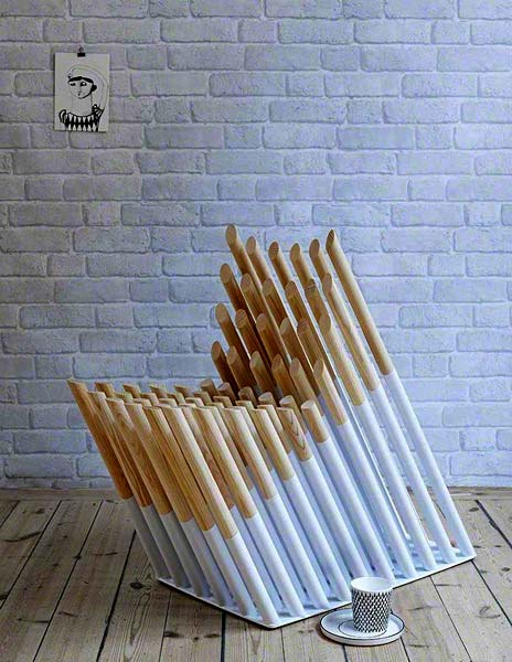 Стул изготовлен из толстых и крепких деревянных «шипов», которые в этом проекте заменяют и сидение, и спинку. Вес сидящего распределяется на 60 с лишним колышков разной длины, установленных в стальном основании. Размеры деталей подобраны так, чтобы сидящему было удобно, и он мог максимально расслабиться. Кстати, такой стул можно использовать для профилактики сколиоза и других проблем, связанных с длительным сидением за компьютером.