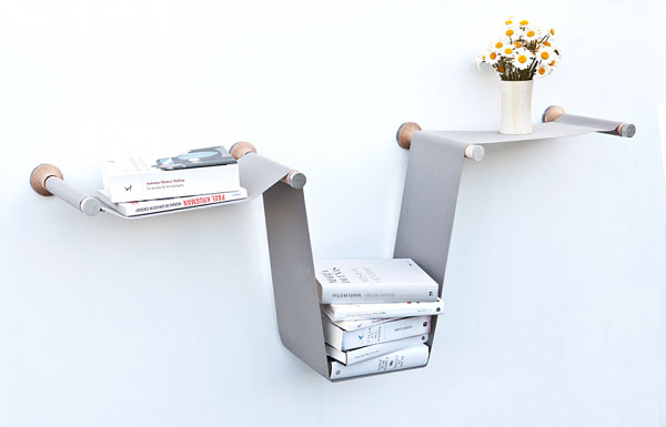 Каждый из трех образованных крепежными элементами и лентой отсеков может менять свою глубину, в зависимости от степени тяжести груза. Это забавное и творческое решение является отличной альтернативой унылым традиционным полкам.