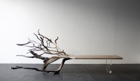 Скамья сделана из дуба с использованием прозрачной стеклянной плиты и существующих веток в качестве ножек. Основная цель дизайнера – это раскрыть и вернуть дерево к жизни и обнажить его изначальную самобытность – силу, неукротимость и, прежде всего, великолепие